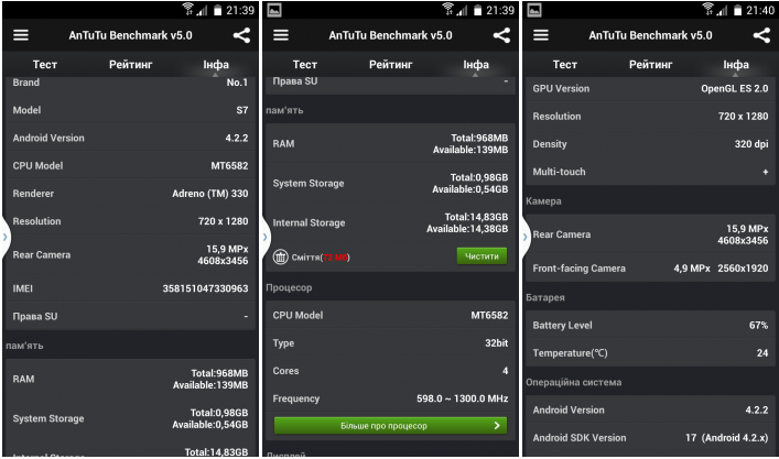 В общем, железо No.1 S7 неплохое, с производительностью чуть ниже средней. Например, на невысоких настройках графики смартфону под силу такие игры, как Dead Trigger 2 или Real Racing 3, а это тяжелые современные 3D-игры. Также смартфон без проблем воспроизводит большинство форматов видео с разрешением до FHD.